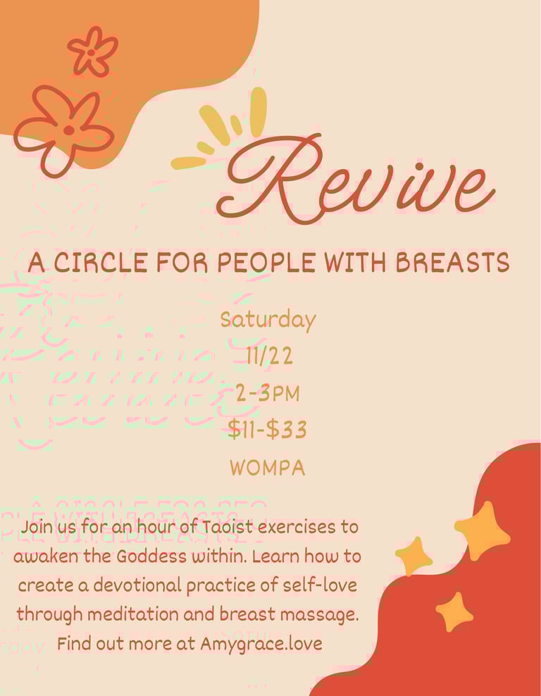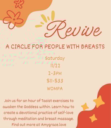 Join me for a unique circle of Taoist breast massage exercises to cultivate energy, balance hormones and connect with your body. This is a safe space to be just as you are. All instructions are optional and you are never expected to go beyond the boundaries that feel comfortable for you. This is a personal practice intended to promote health and begin a foundation of practices you can cultivate at home. You will work on your own body, there is no partnered aspect of this circle. I will be guiding each step of the way with Taoist exercises I first learned in 2012 with Arabella LaVey in Austin, Texas. You are welcome to bring a journal and water bottle. This class is offered at a sliding scale $11-$33 and can be paid with cash, venmo, cashapp or paypal. We will be meeting at WOMPA in Tulsa from 2-3pm on Saturday 11/22/25. This circle is appropriate for people with breasts who are old enough to have had their first menstrual cycle. If you would like to join RSVP is required. You can sign up by emailing hello@amygrace.love. Please reach out if you have any questions.
